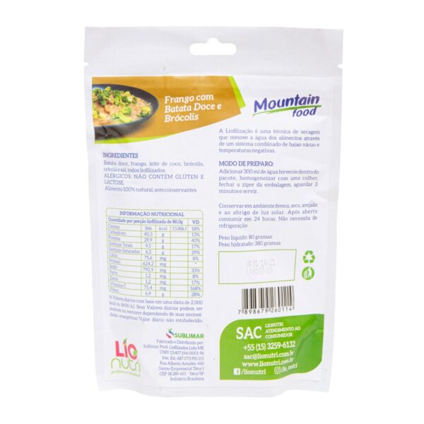 - Ingredientes: Batata doce, frango, leite de coco, brócolis, cebola e sal, todos liofilizados